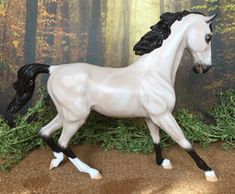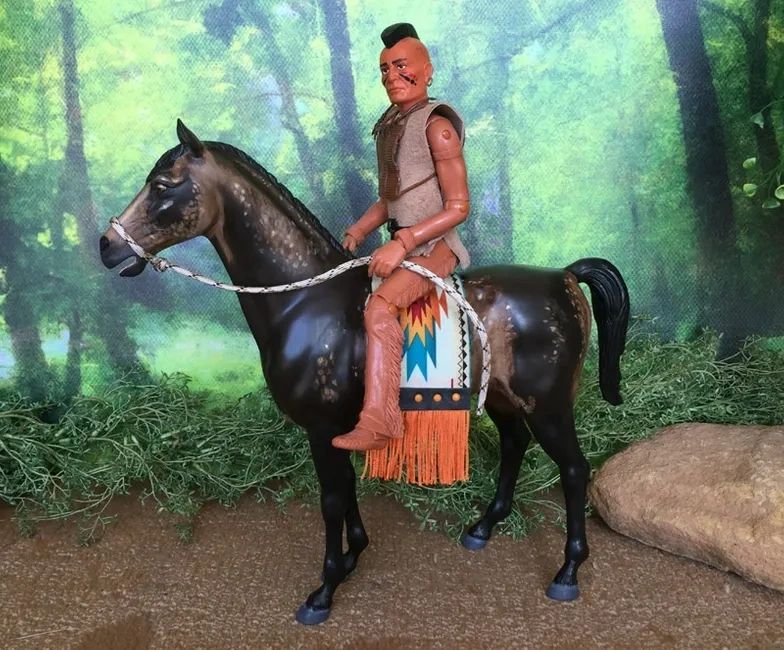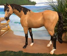 This is a Marx Thunderbolt repainted to a sooty buckskin. He is being ridden by a custom figure by Mykol Blackwell. The horse's blanket is by Lori Bradley.